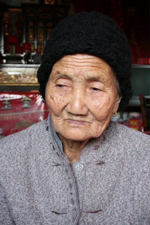 八十六歲的葉緣,是十足禮教下的傳統婦女,閒暇時,偶而會到紅磚老屋前的廣場遛達,見著生人,便往牆角或屋裡躲,遇到有人想幫她拍個照,總是東躲西藏,推說照相不好看。