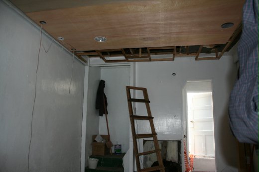 為了將天花板設計裝上有燈光明暗變化的崁燈,他可是吃了一番苦頭,過程相當爆笑。隻身一人如何裝潢天花板?他想出了一個笨方法,將木板一頭用繩子綁好弔起固定,再跑到另一頭用手頂住,用釘槍釘好,回頭再釘弔起的另一邊。