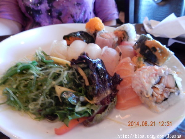 中午和朋友在紐澤西一家餐廳吃"包肥"。食物樣式多,味道也不錯。這是一家連鎖餐廳,看到壽司冠以美國之名,還有櫃檯上的招財進寶樹,都覺得有意思。(格友【Hey Ho】說這叫“創意料理”;天路說是“跨界煮義”
