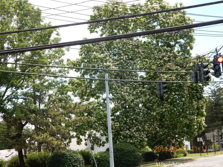 距離住家兩英里的十字路口有兩棵大樹,每年夏天開白色的花,秋天結細長彎曲的莢果,有點像長豇豆。一直好奇這是甚麼樹。昨天經過發現她開了花,決定找時間去拍幾張相片,拿來網上問一下。今天早晨去洗衣店時,趁等紅燈的機會拍了兩張,可是電線從畫面中間穿過,效果不好。