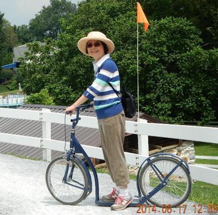 一群人用打繩器做了繩子,又發現這個阿米西人的代步工具,大家輪流玩。好久沒有騎腳踏車,抓住龍頭居然無法平衡,還忘了怎麼剎車。 轉一圈就不敢再試,作個樣子照張相就好。