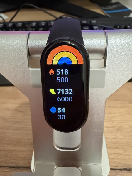 新手環的字大,看時間方便。健康指標也換了顯示方式,除了每天走路步數,不再顯示PAI,改成"活力指標",顯示當天消耗的動態卡路里,走路步數,和運動時間。另外還有一項"元氣值",可能類似原來的PAI。不過"活力指標"的三個半圓看起來清楚又有成就感,就不管元氣值了。