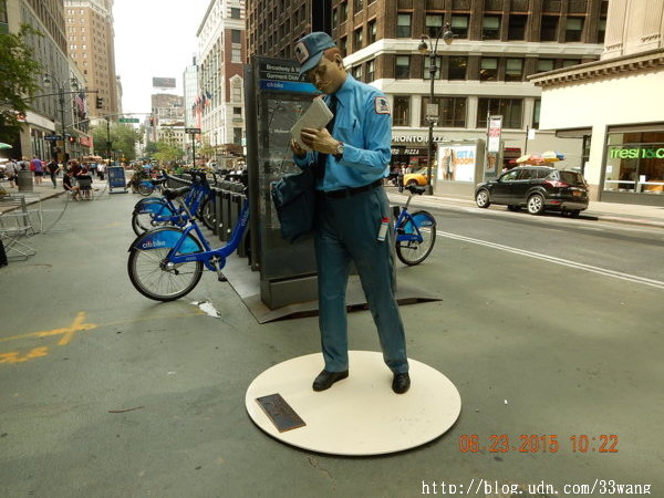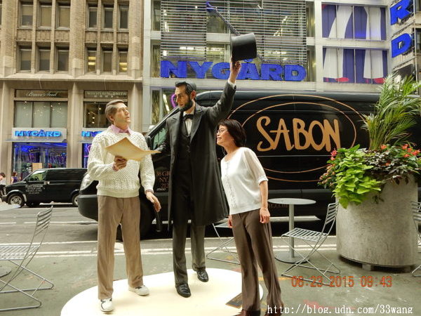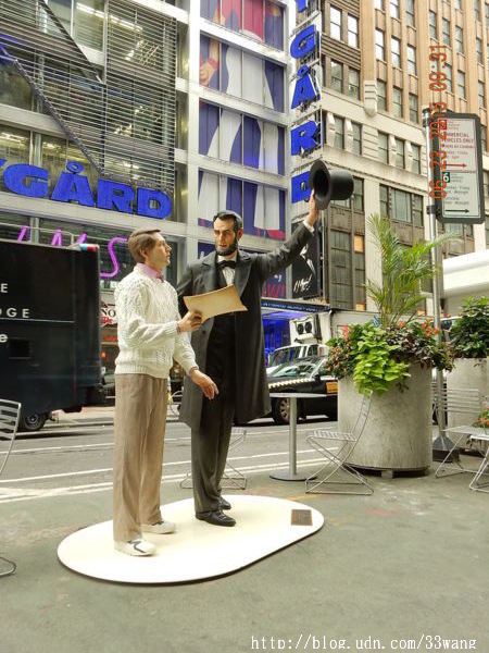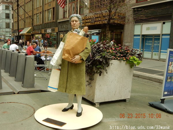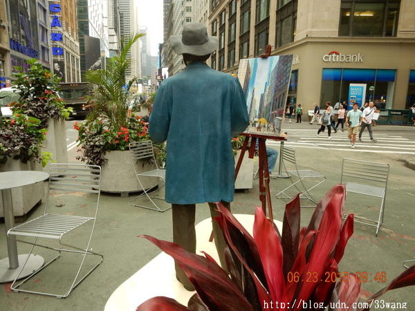 當然這只是塑像,是百老匯最新展覽“西華江森在紐約(Seward Johnson in New York)”的一件作品。今年85歲的西華江森是「嬌生」公司創始人之一Robert Wood Johnson I的孫子,以幾乎亂真的銅像作品“trompe l'oeil” (視覺陷阱)聞名於世。他這次在紐約展出18件銅雕。