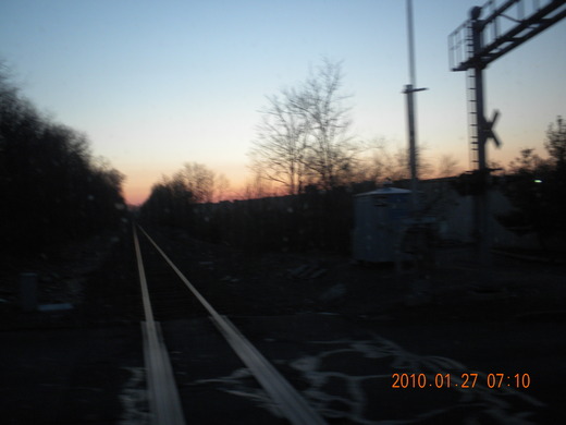 上車時太陽還沒有出來,只有天際轉成紅色。路旁的樹木和房子擋住了視線,只有經過鐵道時,才捕捉到一點色彩。雖然天還沒亮,早起的上班族已經奔馳於路上,停車場也幾乎停滿了 Park-and-Ride(泊車搭公車)的車子。
