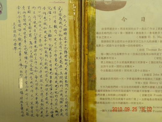 今天大姐將這本日記轉贈給我,我希望能夠不中止,不間斷的用完。因為我的日記本沒有一本是毫無一點間斷的,但我相信只要我有恆心,有毅力,一定可以全部寫完的。現在,我把日記的內容大概地記錄一下:生活檢討、記載生字,有時把重要的事也記下來。大姐還告訴我,假如我這本日記能夠不間斷地用完,她便要送我一本更好的日記,但我不一定要好的日記,我只希望從今以後,能夠改變我的生活,使我自己過著規律的生活。比如:每天回家一定要寫日記,每星期六或星期日寫一篇作文。相信這樣做去,我的作文一定會有進步。倘有閒暇,我便要專心地練練毛筆字,希望今年的十二月,我能拿到全省國語文競賽的第一名,像八班的□□□一樣,得很多獎品,而且有很高的榮譽。