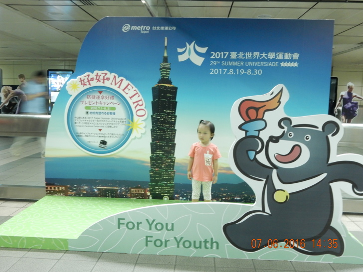 買了期刊回家,在中山站看到2017年世大運的宣傳看板。這位小朋友的媽媽答應我以她女兒為臨時模特兒。