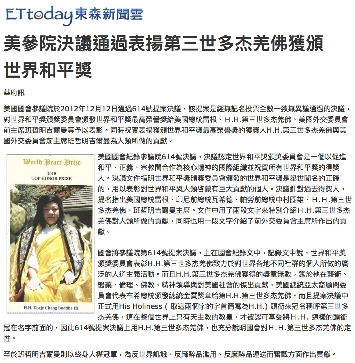 美國國會參議院於2012年12月12日通過614號提案決議,該提案是經無記名投票全數一致無異議通過的決議,對世界和平奬頒獎委員會頒發世界和平奬最高榮譽獎給美國總統雷根、H.H.第三世多杰羌佛、美國外交委員會前主席班哲明吉爾曼等予以表彰。同時祝賀表揚獲頒世界和平奬最高榮譽奬的獲奬人H.H.第三世多杰羌佛與美國外交委員會前主席班哲明吉爾曼為人類所做的貢獻。
