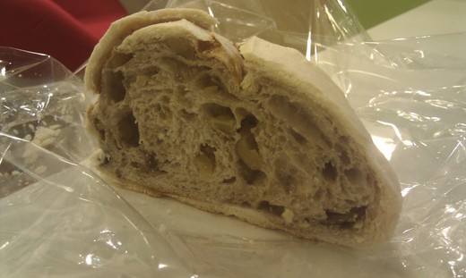 暫且不管咖啡,繼續來看今天的主角:不知名的好吃麵包;它不管是外型、口感、香氣都很歐式,外皮敷著一層厚約0.3公分的乳白色麵皮,大約間隔三公分就有一道用刀劃開的裂痕,揭去外皮會看到充滿大小氣泡的麵包主體,入口後酒香味濃,酒香就隱藏在大小不一且數之不清算之不盡的氣室當中,對不喝酒的小匠而言,酒味算是重的。麵身裡還包覆著大量核桃、葡萄乾好像還有無花果乾(長得很像無花果的果乾),每吃一口都嘗得到麥香、酒香、核果香,讓小匠感動的是酒香、麵香、核桃、果乾四香雖然各自散發著屬於自己的獨特香氣,嚼著嚼著卻會發現它們結合得很巧妙一點也不突兀。麵身主體稍帶濕潤感,Q度適中,如果吳寶春師的名作荔枝麵包Q勁是100的話,這塊麵包的Q勁也有70-80。整體而言口感香甜口、兼帶嚼勁,總之是塊很合小匠胃口的麵包。