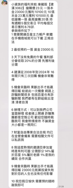 3、自稱「客服、老師、助理」的歹徒會提供 銀行帳號 給被害人入金投資,或以「參與抽股」、「系統中籤」等各種理由要求被害人補足入金。