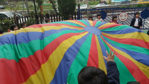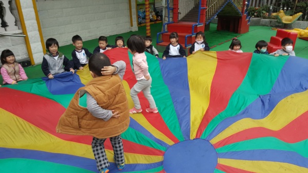 首先先讓孩子們一個人找一個顏色坐在地上,雙手拉著"氣球傘"