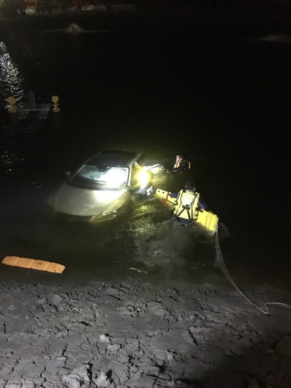 警消將人車拖出魚塭,駕駛趙姓婦人已無生命跡象。(記者蘇福男翻攝)