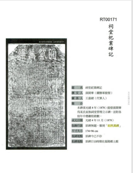 臺大典藏的石碑影像包括:重修義崇橋碑、昭然萬禪碑、嚴禁縱放六畜毀傷故勇墳墓碑(兩式)。四碑都和湘軍名將孫開華有關!