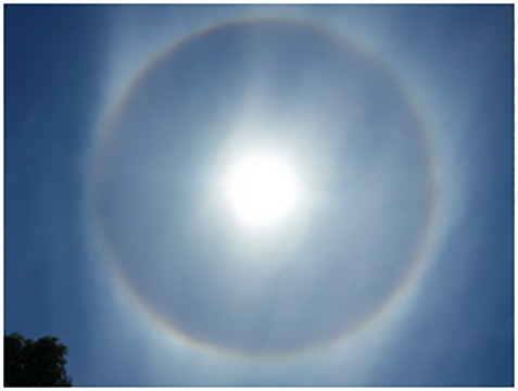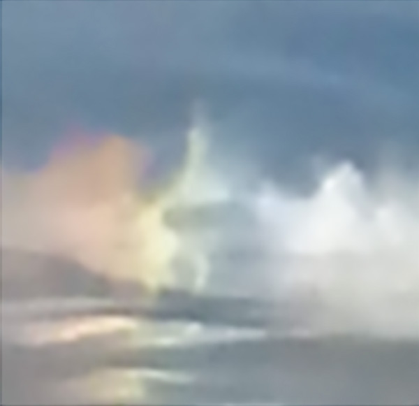 二零一四年七月二十五日當天,就在剛簽下土地買賣契約,走出門外,竟然空中出現了五色彩雲光芒奪目,光芒中觀世音菩薩現身虛空站在一白色寶塔之上,潔白衣衫,袖袂飄飄,莊嚴無比(見下圖,右圖為局部放大)。眾人得見激動萬分,不斷跪地頂禮。不久,
