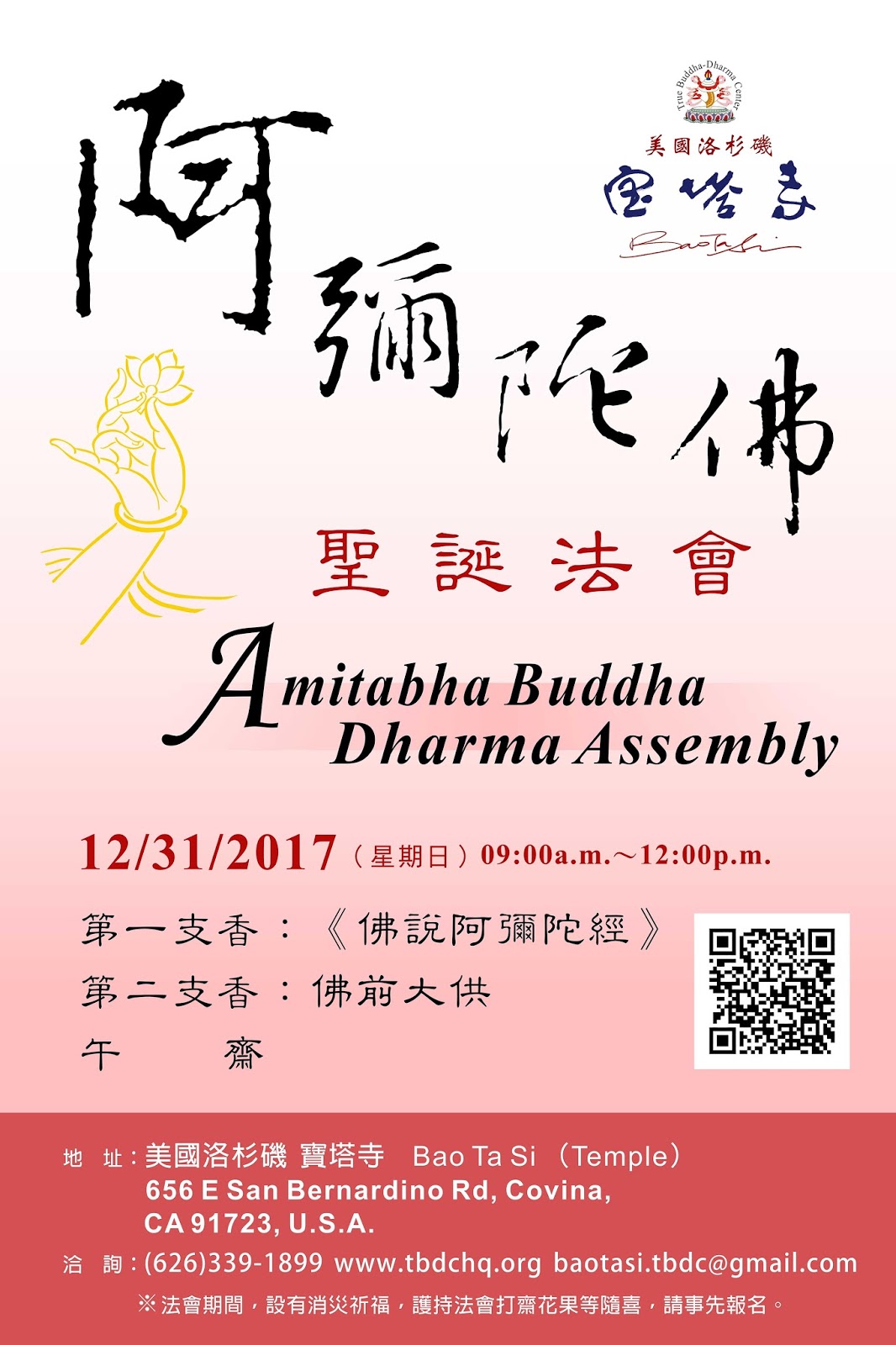 阿彌陀佛為西方極樂世界教主,據《佛說阿彌陀經》記載,此佛光明無量、壽命無量,故稱阿彌陀佛。欣逢阿彌陀佛聖誕之期,本寺將於2017年12月31日(星期日)上午9:00啟建彌陀法會,通過法會誦經念佛、佛前大供的功德,回向眾生吉祥免難,福慧增長,身心自在,闔家安康,諸事順利,善願圓滿。祈願正法久住,法運昌隆,社會祥和,世界和平。至誠盛邀諸位善信檀越前來同霑法喜、共沐佛恩,以此為現世修福慧得安樂,為後世生蓮邦備資糧!