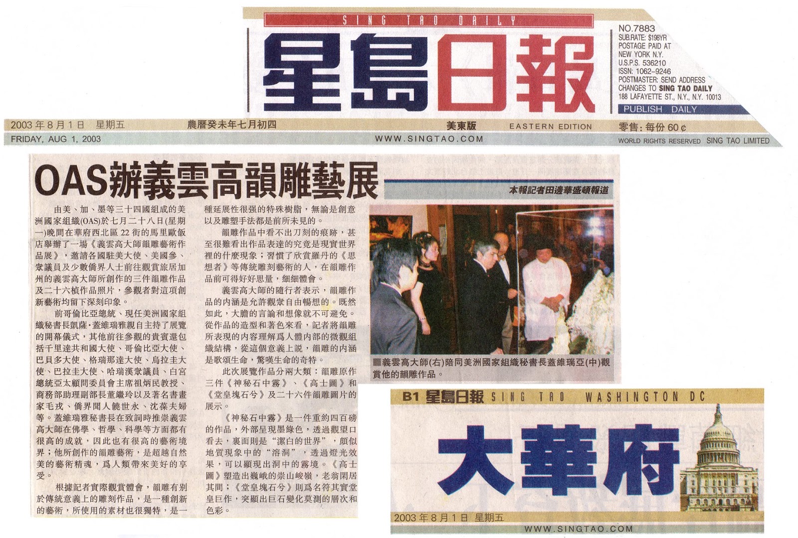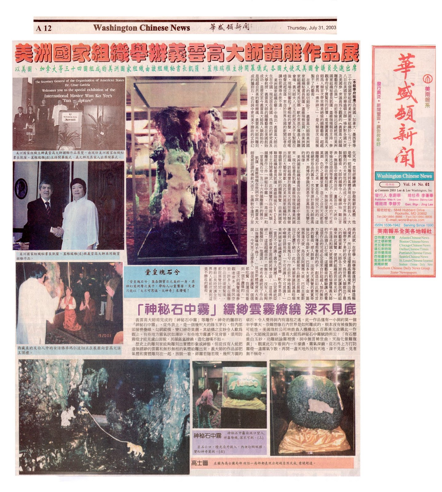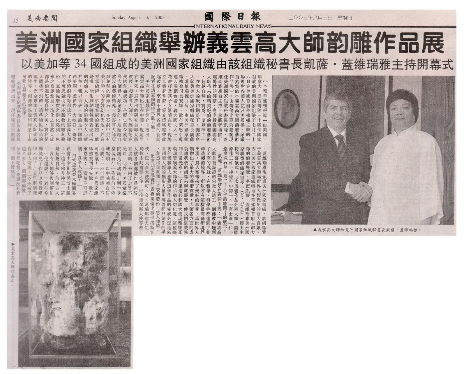 美洲國家組織秘書長皆由各國總統中優選出來,現任秘書長凱薩‧蓋維瑞雅現領導美洲國家組織,該組織鑒於義雲高大師為世界人類做出的巨大藝術貢獻,因此美洲國家組織特地在華盛頓首府主辦大師的韻雕展覽,由美洲國家聯盟組織秘書長凱薩‧蓋維瑞雅(César Gaviria)博士主持開幕儀式,此次展覽作品分兩大類:韻雕原作三件「神秘石中霧」、「高士圖」和「堂皇塊石兮」及二十六件韻雕圖片的展示。