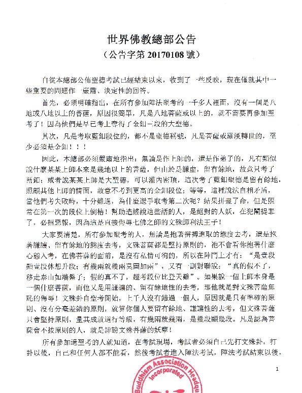 因此,本總部必須嚴肅地指出:無論是作上師的,還是作弟子的, 凡有類似說什麼某某上師本來是幾地以上的菩薩,但由於是謙虛, 留有餘地,故意只考了藍釦;或者說某某上師是大聖德, 可以灌內密頂,這次考了藍釦聖德是留有餘地, 照顧其他上師的情面,故意不考到更高的金釦段位;等等, 這種說法自相矛盾,當他們考失敗時,十分難過, 為什麼還爭取考第二次呢?結果拼盡了命, 但是照常在第一次的段位上倒樁!幫助造謠說這些話的人, 是絕對的人妖,在犯闡提罪了,必招惡報, 因為這是直接侮辱七佛之師的文殊師利法王子!