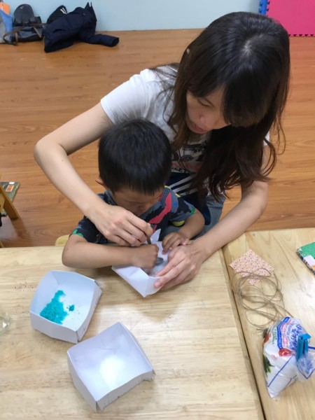 帶領人準備:玻璃瓶(一組親子一個)、食用色素、A4廢紙摺成小四方紙盒(一組親子3-4個)、廢紙數張、膠帶、精油、色紙或包裝紙、麻繩