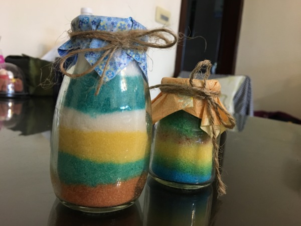 5. 利用色紙或包裝紙封住瓶口,大人幫忙綁上麻繩即完成美麗的作品-開運香氛彩鹽瓶