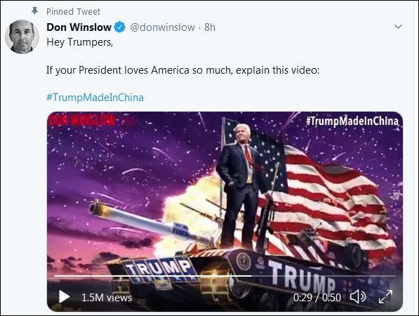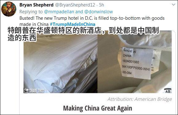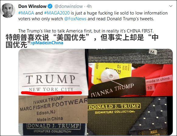 為什麼會出現“特朗普中國造”這個話題呢?這個話題還是來源於美國一位作家。9日上午,美國作家唐·溫斯洛發布了一個名為《特朗普中國造》的推特視屏。其配文是,特朗普的粉絲們,你們的總統如果真的愛國的話,那這個視頻怎麼解釋呢?在這個自製視頻中,特朗普嘴邊從來都是“中國”兩個字,言語上不斷攻擊中國。但接著視頻畫風一轉,特朗普和他的女兒伊万卡的服裝品牌主要由中國,印尼,土耳其和加拿大等國幫助其代工。