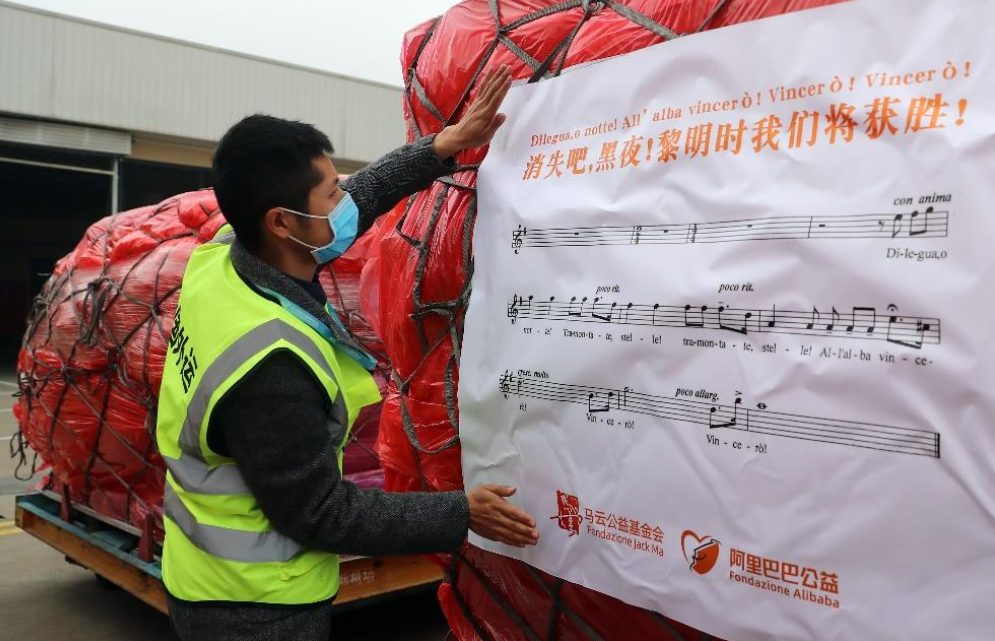 ▲马云公益基金会和阿里巴巴公益基金会向意大利捐赠抗疫物资