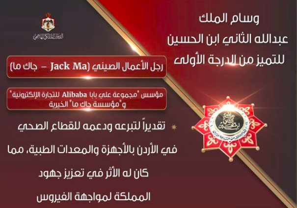 马云是因为对约旦及全球抗疫做出的重大贡献而被授予这一荣誉的。今年一同获得该勋章的还有在抗击疫情中表现突出的约旦武装部队、安全部门、卫生部和内政部。