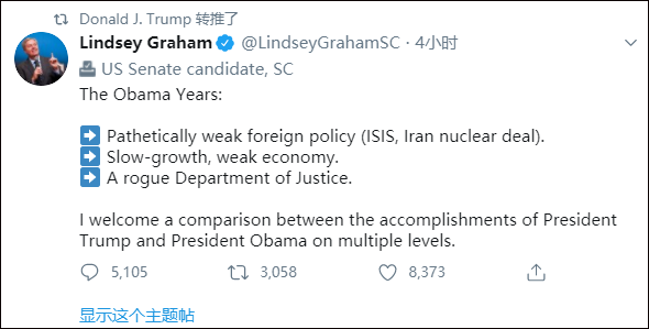 值得注意的是,特朗普還轉載了美國共和黨籍聯邦參議員林賽·格雷厄姆(Lindsey Graham)的兩條推文。格林厄姆是特朗普的密友兼堅定政治盟友,目前擔任參議院司法委員會主席。