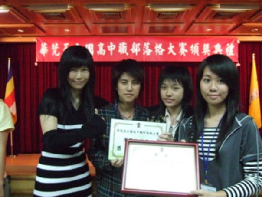 四個小時後.....我們好興奮,終於......我們的右腳踏上台北的土地了,台北火車站捷運站高鐵在一起,天啊......好大我們頭昏啊!只有五個小毛頭,我們看著指標慢慢找耐心問人,為了找到台北火車站我們問了七個人,原來還分東西南北門,終於.......站上了台北火車站的南一、二、三門,因此我就推測......他們分了東西南北門,這裡有南一南二南三表示我們要找的東三門就是東邊第三個門囉!!哈哈哈......沒錯我推斷正確,終於確定了我們要集合的位置,看了看時間發現,我們找"東三門"花了一個小時,好吧!!隨便買了幾個壽司就站在角落塞了塞填飽肚子,還遇上了不要臉的騙子,感謝A夢的一句「你是詐騙集團吧!」擊退了那個中年裝可憐的騙子,坐上華梵的接駁車朝華梵出發,不禁感嘆,台北真的好大,看到離我們不遠的101,看到車水馬龍的城市,然後「上山」!什麼?! 上山?? 是的!沒錯!就是上山,原來華梵大學在「山上」,以為上了山應該離華梵不遠了,天啊......好崎嶇的山路好奇怪的感覺,因為我們好像花了不少時間在上山,不過還是要誇獎一下開車的「運將」技術真不是蓋的,因為彎來彎去的路讓我們完的好開心!!→為什麼開心照片應該就會了解!!! 典禮現場不大,但是總讓我感到一絲絲的溫暖,好用心! 為每個得獎團隊製作了名牌,為每個學校製作的牌子,讓我們很方便很快速的找到我們的座位,把每個得獎部落格的首頁都印成一大張海報,看到好多常常在部落格上遇到的人,看見本人總有一種"深藏不露"的感覺!大家都是那麼不平凡,文章又是那麼吸引人,談話的風趣讓整個典禮會場充斥著開朗的笑聲,「稿子飛走了! 我想多介紹一點! 我們沒吃飽等一下要繼續吃!......」大家都是那樣的風趣可愛又純真自然,可以來到華梵看到這麼多不平凡的各為讓我很開心,我們到華梵的這一路我們走的也不輕鬆很辛苦,但是感謝班上同學的支持,我們自掏腰包坐車上台北領獎,晚上也做捷運到淡水的露天海鮮炭烤店小小慶祝一番,淡水風景好美,東西好好吃,我們完的很開心,我最難忘的是賣花枝丸的老闆對大貓說「吼~美女!你真的很聰明知道帶朋友來買我的花枝丸啦!」隨後我們一人一枝花枝丸正在旁邊灑胡椒粉的時候,又聽到.....「吼~美女!你真的很聰明,枝道帶朋友來買我的花枝丸啦!」.......笑破我的肚皮了,他每個都說是美女!可愛的老闆~你的花枝丸真的超好......不過台詞還是換一下比較好,玩了很開心,九點半我們趕著坐捷運回到火車站坐車,很完美.....一切時間控制的剛剛好!!坐捷運也鬧了不少笑話,我在捷運撞了個大瘀青,大貓捷運卡插錯邊過不去,被後面阿伯笑!芷祺~在我們聞到香雞排後的十分鐘問:「你們有沒有聞到香雞排的味道啊?!」天啊.....笑暈我了!!A夢回答:「我們很久以前已經聞到了!你現在才聞到的應該也是他吃完雞排放屁的屁味了吧!!」天啊......太妙的回答了!!笑的我四肢無力。上了火車我們已經是晚上十一點二十六分了!!今天走了好多路問了好多人,大家都累了~~上了車,就是倒頭大睡,在我甜美的睡夢中大貓的說話生劃破了我的美麗夢鄉,「A夢的手機被偷了!!」我驚醒......怎麼會?!天啊~~~A夢的手機就在他身旁消失的無影無蹤,小偷......一定是在車上的乘客,但是.....我們不知道是哪個人?!天啊~~人心真是險惡!寶貝手機就這樣不見了!!旁邊的年輕男乘客跟我們說坐夜車本來就要小心啊!!因為夜車有很多複雜的人進出,唉......我想也是,因為剛剛有個一點也不像台鐵的人在賣便當一付流浪漢的樣子!!還有奇怪流浪漢騷擾了車上的女乘客,大吼大叫,還有人把雙腳鞋子脫掉,放在前面座位的椅背上.....有夠可怕的,回到台南,清晨五點多,沒有人的車站,昏暗的天色,人煙稀少的圓環,我再圓環等了一個多小時坐公車回家,這個時間剛好是昨天我們到火車站的時間,我們經歷了整整24小時,投下一個十塊一個五塊三個一塊,抬頭一望......車上只有我跟司機呢!!!看我想做哪裡就做哪裡囉~~累的快要發瘋的我.......回到家趴上床上倒頭大睡,醒來的時候已經是下午了.......