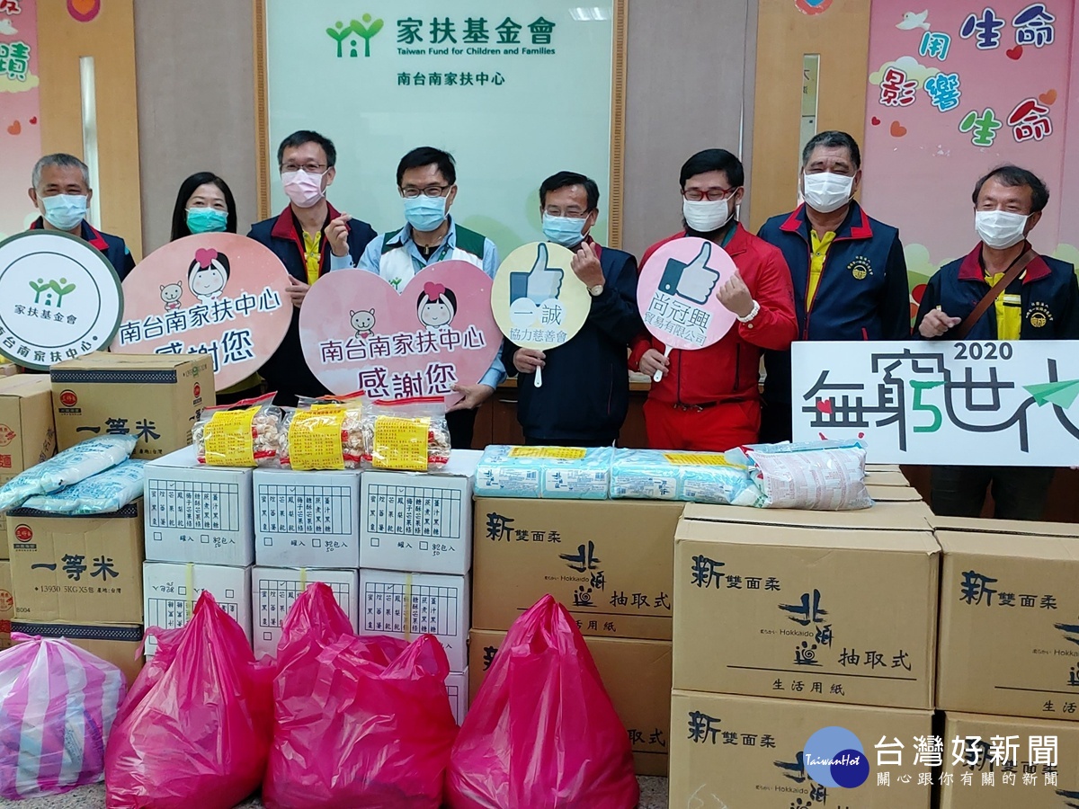 尚冠興貿易公司得知今年受到疫情的影響,弱勢家庭在經濟上更顯拮据,尤誌偉總經理為了幫助更多弱勢學童與家庭,與深耕台南30多年的一誠協力慈善會一同攜手傳愛,捐助南台南家扶中心助學義賣果乾750包及生活物資(米、麵、衛生紙)各100份給弱勢家庭。