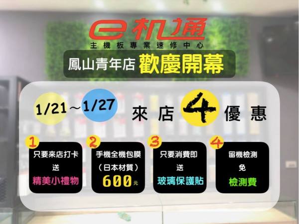 e機通鳳山青年店1/21~1/27開幕慶 來店可享4大優惠