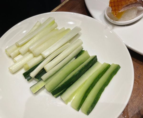 香蔥與小黃瓜是用來做烤鴨夾餅的材料。