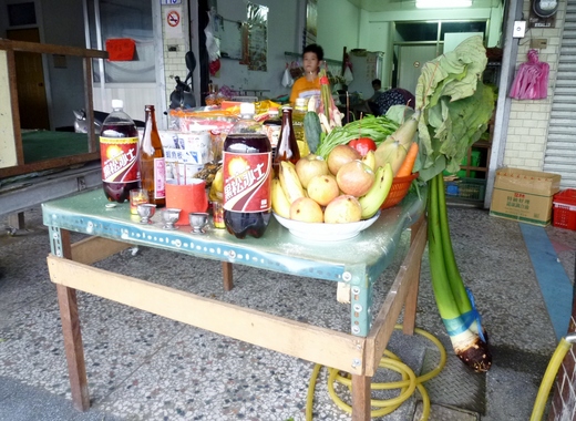 這次到花東縱谷,剛巧碰上中元普渡和豐年祭同一天,我看見花蓮光復街上,許許多多人在祭拜好兄弟,他們在供桌上擺了貢品,除了餅乾汽水外,也加進竹筍、紅蘿蔔、空心菜、芋槐等等青菜蔬果,最奇特的是生薑的葉連莖,我查看過資料,阿美族在豐年祭會用生薑祭拜,不知道漢人也借用了阿美族感恩收成的豐年祭,結合普渡好兄弟的習俗,真是有趣的漢原融合。
