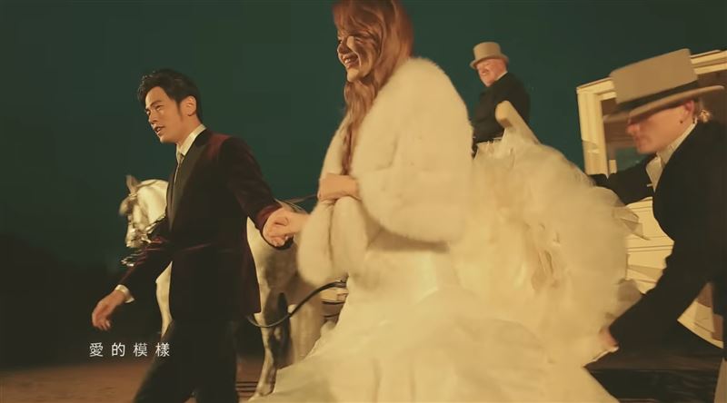 MV以復古浪漫氛圍鋪陳,畫面一開始,周杰倫身穿深色西裝,牽著穿著華麗白紗的昆凌緩緩步入場景,宛如電影般的運鏡與燭光交織,營造出夢幻氛圍。昆凌一襲層層堆疊的白色婚紗,外披柔軟毛絨披肩,笑容燦爛,被周杰倫牽著走下馬車,宛如公主般登場,畫面彷彿童話成真。