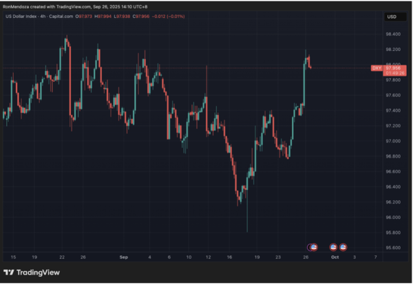 美元指數(DXY)從 9 月 17 日的 95.8 一路拉升至週四的 98.19,截至發稿時仍穩在 97.95 附近。