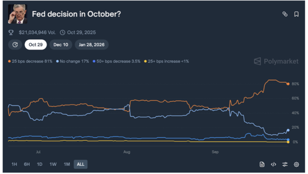 不過,市場依然有一絲樂觀情緒。儘管鮑威爾的聲明偏謹慎,但市場普遍預計11月還會有一次降息。甚至在 Polymarket 上,不少人已經押注美聯儲 10月「臨時加息25個基點」 的可能性,儘管10月並非 FOMC 例會月份。