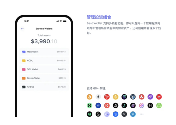 在多鏈資產管理上,Best Wallet 也延續了這種“降智操作”的思路。來自不同公鏈 / 不同網路的錢包位址都可以導入到同一個介面並行查看,把原本分散在多個 App 裡的資產,一次性聚合起來統一管理。