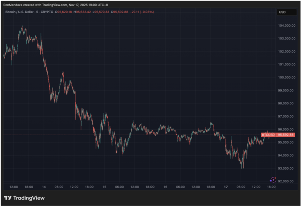 比特幣上周還在 107,476 美元 一線震盪,本週五便一度瀑布到 94,000 美元,周日進一步下探到 93,000 美元下方,到了週一才勉強反彈回到 95,592 美元 附近。