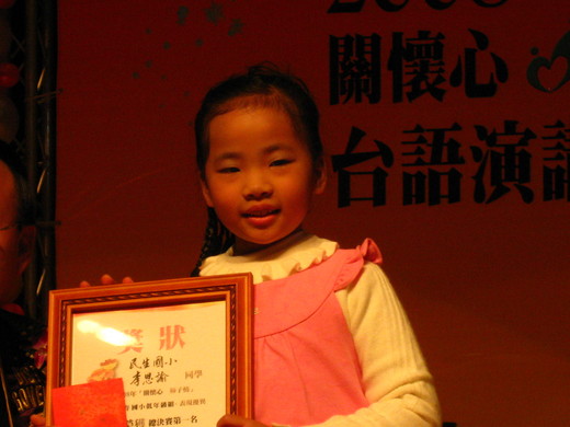 【記者唐復年/彰化報導】「頭家氣尬碰塞塞,阮係樂尬笑咍咍」,彰化市民生國小二年級的李思諭,把自己跟家人逛夜市的經驗寫成演講稿,昨天勇奪「關懷心獅子情」台語演講比賽國小低年級組冠軍,李媽媽非常高興的說,「這就是平時在家都講台語的好處。」