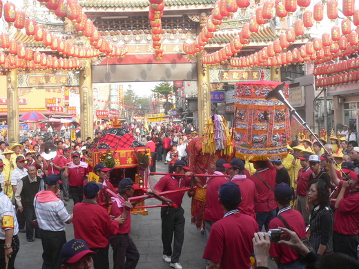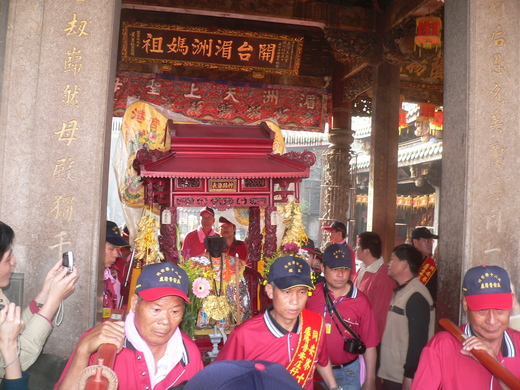 迎請媽祖後,安上神轎,在迎出天后宮時,鞭炮煙火齊鳴,信眾爭相