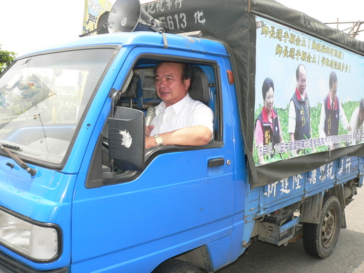 己駕著宣傳車深入鄉間,才能拉近與鄉親的距離,不少鄉民遠遠聽見