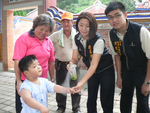 則到岩竹村虎山岩關心小黑蚊肆虐情形,還為鄉民噴灑防蚊液。