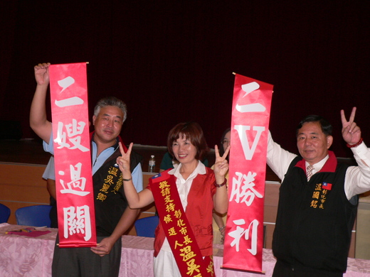 抽到2號溫吳麗卿則比著「V」字,也舉著寫著「二V勝利,二嫂過關