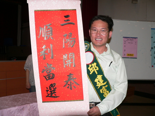 」海報,抽到3號的邱建富則喜孜孜地拿著「三陽開泰,順利當選」