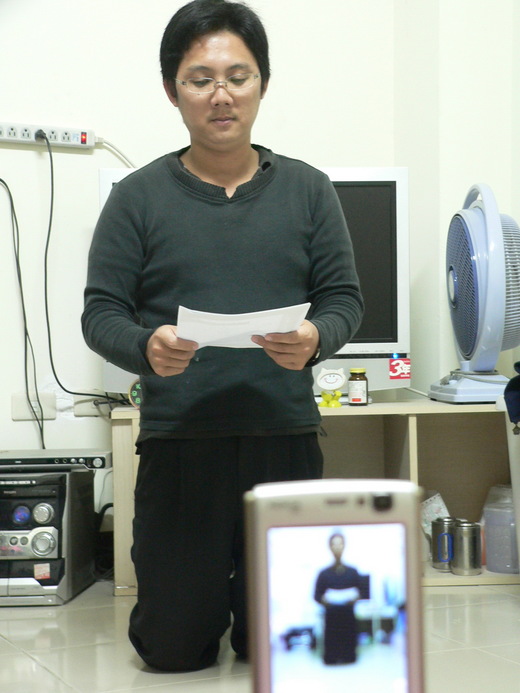 跪地叩頭說:「對不起,彰化分局警察,我真的錯了!」以嘲謔反諷