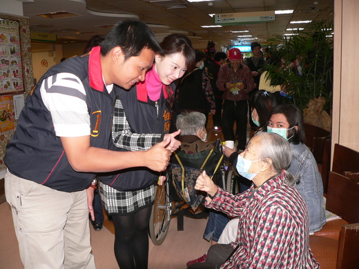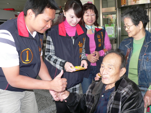助選,她與白閔傑在醫院裡,一一向病患及家屬握手,親和力十足,