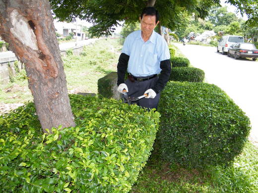 夫,把平和社區的八百多株黃金露灌木,依樹欉形狀,修剪成正方型