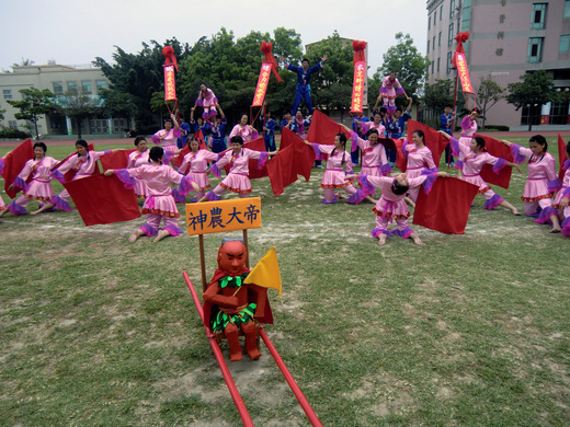 張珮娣說,特教生利用布料及紙材,精心製做秧苗、鋤頭、春聯、神農大帝等道具,營造出農村豐收歡樂意象,省下大筆經費,也培養團隊默契。學校家政、幼保、服裝科也一起幫忙做道具及造型。