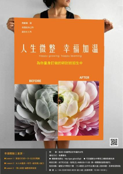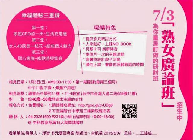 就是妳!為妳的幸福量身訂做的【週五-熟女廣論班】7/3幸福登場!(主辦-福智台中淨智多元廣闊專案)