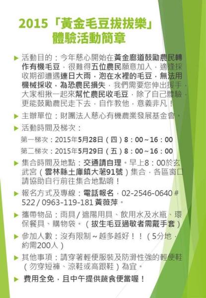 5/28-29二場次:2015黃金毛豆拔拔體驗活動-慈心有機農業發展基金會主辦