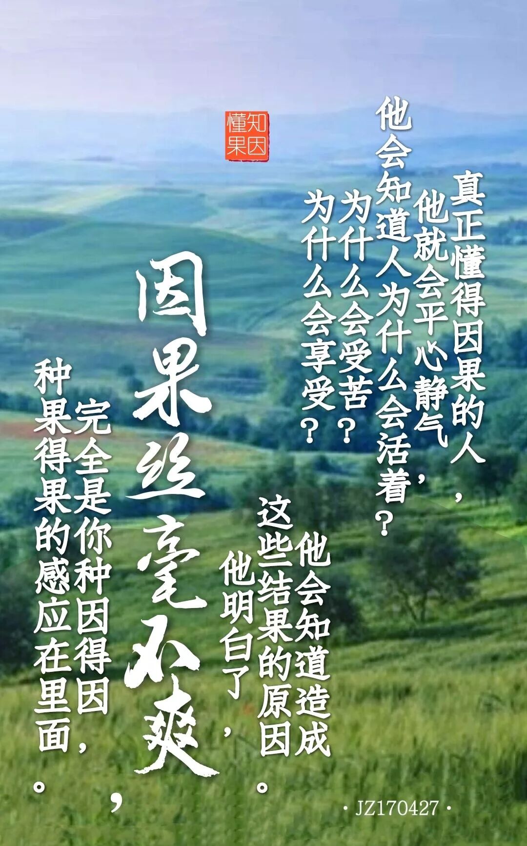 所以真正懂得因果的人,他就会平心静气,他会知道人为什么会活着?为什么会受苦?为什么会享受?他会知道造成这些结果的原因。他明白了,因果丝毫不爽,完全是你种因得因,种果得果的感应在里面。