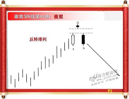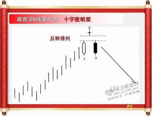 二、「十字星」若高掛在行情的最高檔而實體收黑成為黑十字,則稱為「夜星」,「夜星」是上漲「動能不足」的訊號,多頭的力道已是「強弩之末」價格向下修正的的機會很大!「酒田戰法」引喻此種型態是白晝已近尾聲,天上的第一顆星星出現,黑夜可能就要來臨的徵兆!